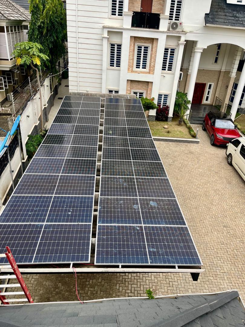 Ongoing installation of high‑efficiency PV panels and string inverters on a rooftop for a private residence in Kaduna GRA to maximize on-site generation and lower electricity bills.